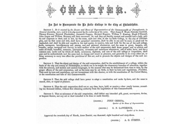 The Commonwealth of Pennsylvania, in 1863, granted a charter for a collegiate department. At this pivotal time in U.S. history, La Salle College was born.