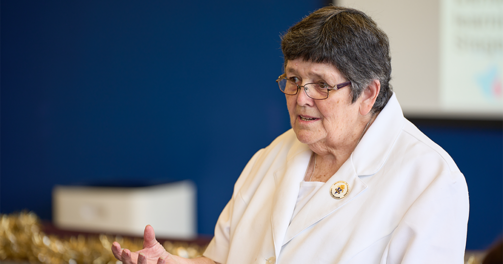 Sister Edward William Quinn, I.H.M., Archdiocese of Philadelphia assistant superintendent of curriculum, instruction, and assessment, teaches students during a presentation.