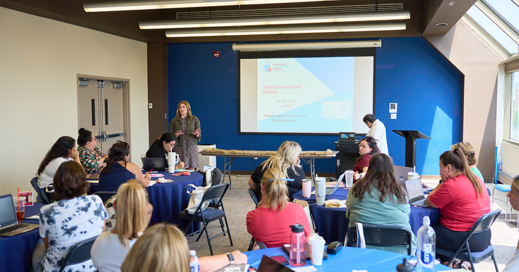 Laura Roy, Ph.D., chair and associate professor of education, (top left) presents a lesson to students.