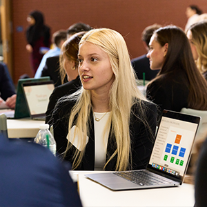 “The BUS 100 course is an exemplar of interdisciplinary business education,” Michael Moll, interim dean of the School of Business, said. “It encompasses a number of disciplines, including marketing, finance, accounting, management, entrepreneurship, operations—it’s every piece that falls under the overarching umbrella of business. It’s the perfect setup for the rest of the students’ college careers.”