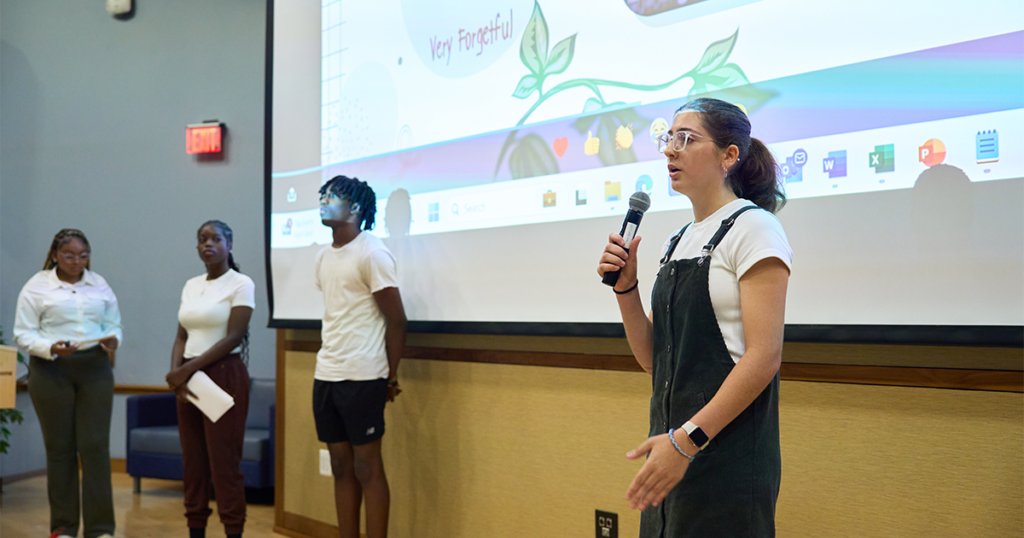 Jemima Oduwole, a LEAP student from Saints John Neumann and Maria Goretti Catholic High School, presented with her group on creating a better way for people to find truth in media posts.