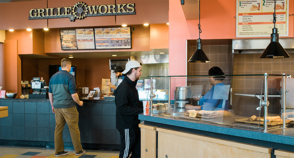 Union Dining is our all-you-care-to-eat dining location in the Union Building. Please note the Union Dining doesn’t allow take-out. You can always bring in food in the room after ordering through Grubhub at any of our retail food locations, but you will not be able to leave the room with food.