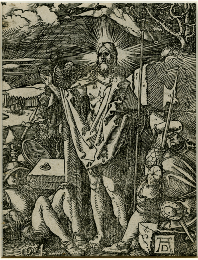 Dominating this woodcut is the larger-than-life figure of Jesus risen from the dead, replete with his wounds visible and rays of light emanating from his head. Clearly the message is victory over death as Jesus holds in his left hand his victory staff with cross atop. “See, despite the suffering and crucifixion, death no longer has power over me!”