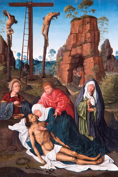 Apart from the Crucifixion, the Lamentation is arguably the most depicted scene of the Passion narrative. Typical of the Flemish school, there are several things happening simultaneously in various vignettes of this single tableau. Of course, the focus is on Jesus taken down from the cross and attended by his mother Mary and the beloved disciple John. Traditionally Mary is clothed in blue and John in soft red. Faithful to the record in the Gospels the artist includes the other two Marys ready to bathe and anoint the body in preparation for burial.