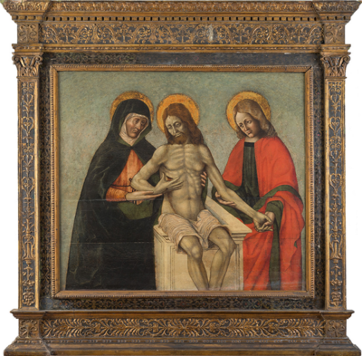 The Man of Sorrows motif owes its name to the Suffering Servant image in Is. 53:3 (“He was despised and rejected, a man of sorrows and acquainted with grief.”) Jesus as Man of Sorrows is typically depicted as semi-naked from waist up with wounds inflicted by a crown of thorns, nails, and spear piercings from which blood flows freely. Our depiction includes Jesus sitting on the edge of his tomb and flanked by his mother Mary and beloved disciple John. It is almost as if to portray a visit to the tomb where Mary and John give Jesus an assist as he balances himself on the edge of the tomb. This scene is of course detached from the narrative of the Passion and is not scripturally supported. It is however consistent with an aesthetic that embellishes scriptural scenes with a human touch. Follow the direction of the arms and you will see the gentle touch of fingers around Jesus’s rib cage, on his elbows and in John’s left hand.