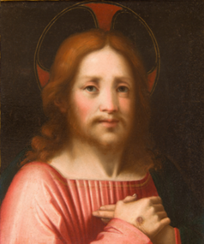 This painting of Christ the Redeemer was made after the manner of Andrea del Sarto who was known not only for his High Renaissance frescoes and altarpieces but also for his portraits. Here in the imagination of the painter the crucified and now risen Christ sits for a portrait. Portrait painting, often commissioned, flourished in the 15th century Renaissance to celebrate and honor individual achievement. Christ here is celebrated for the achievement of his redemption of humanity through his own death on the cross and victory over that death. See evidence of that suffering and death in the stigmata on his hand where the nail pierced and attached him to the cross. And imagine him, as the painter does, now risen from death and sitting for his portrait with scars to prove his achievement.