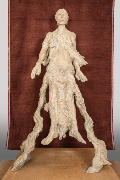 This sculpture in bronze tells the story recounted in John’s Gospel where Jesus arrives in Bethany after the death of his dear friend Lazarus. Weeping over the death, Jesus raises his friend from the tomb where he had been buried four days earlier. Cairns’ Lazarus is a slender, floating figure portrayed in rigid metal. Although Lazarus is brought back to life, the sculpture’s rough surface evokes bodily decomposition and also makes visible the artist’s assertive hand. Not only do we see the body elevated but we also see it wrapped in its funeral garments. The entire light-colored composite is set against a darker brown backdrop in the museum, which serves to highlight the victory of life over death and thus presage Jesus’s own resurrection.
